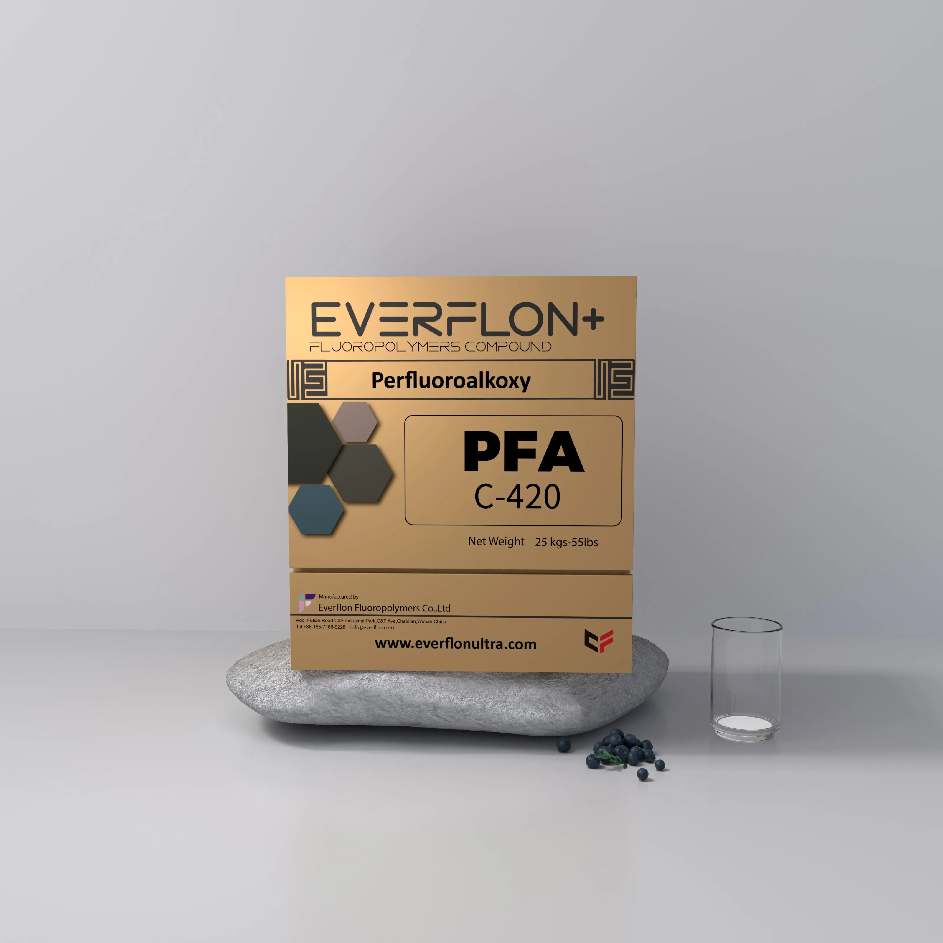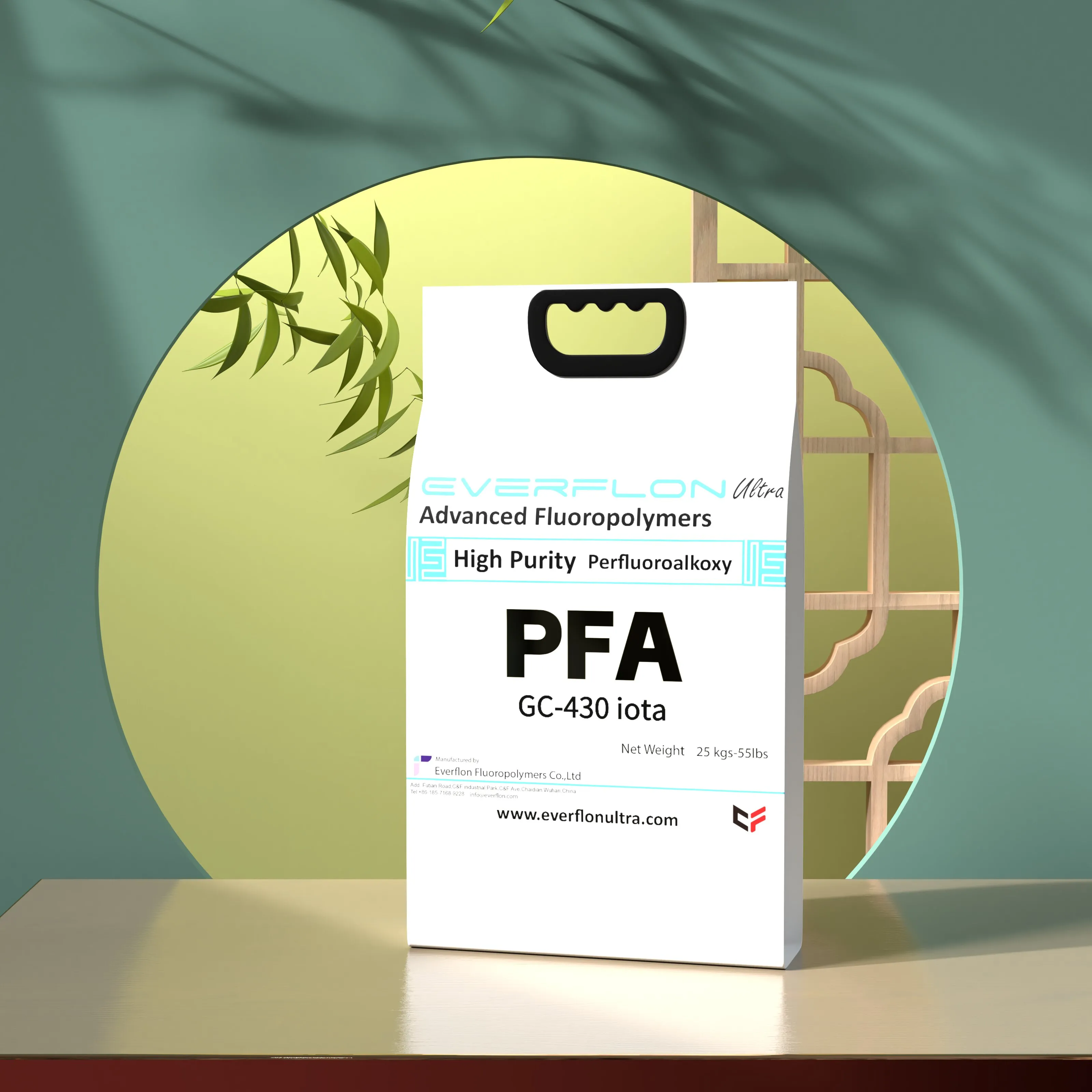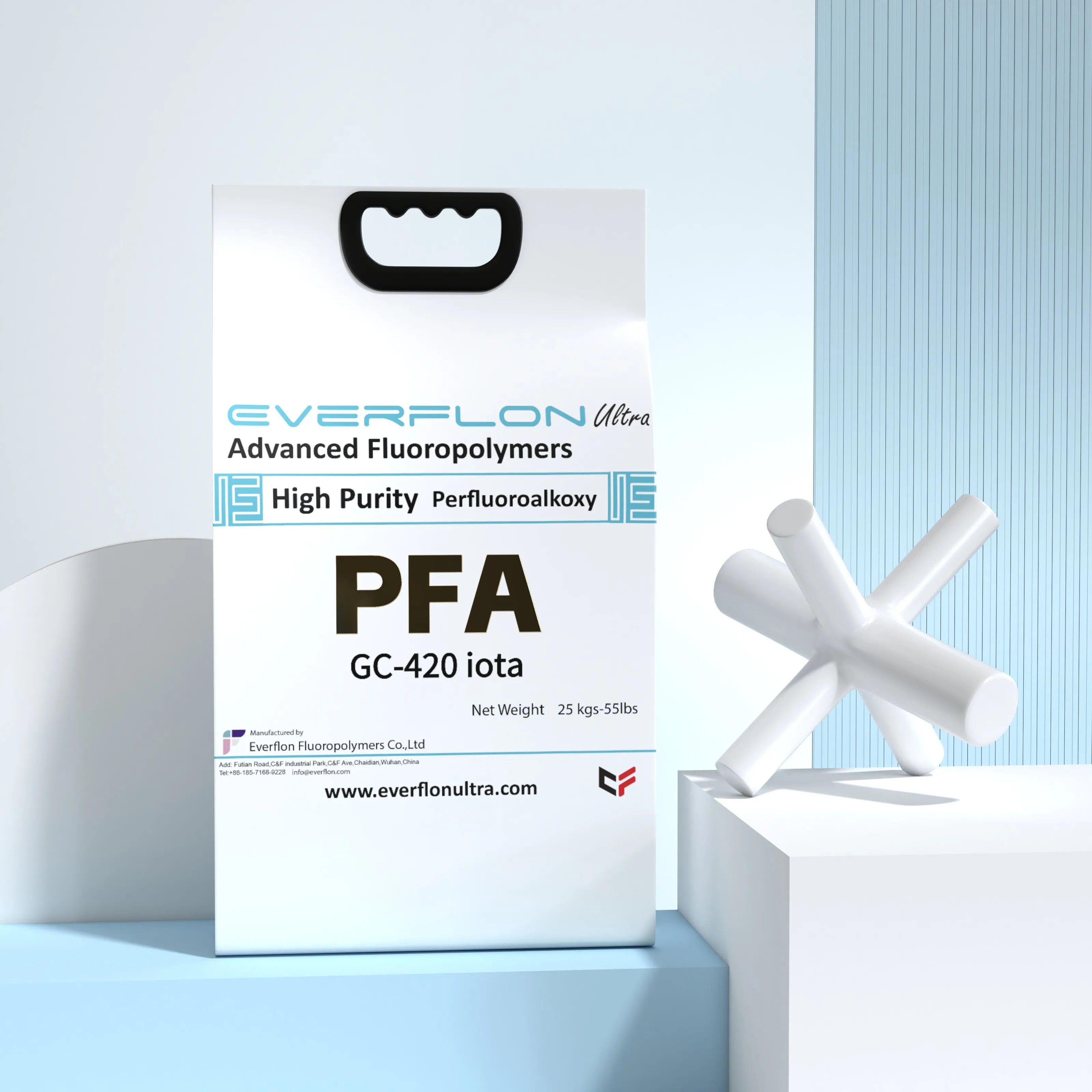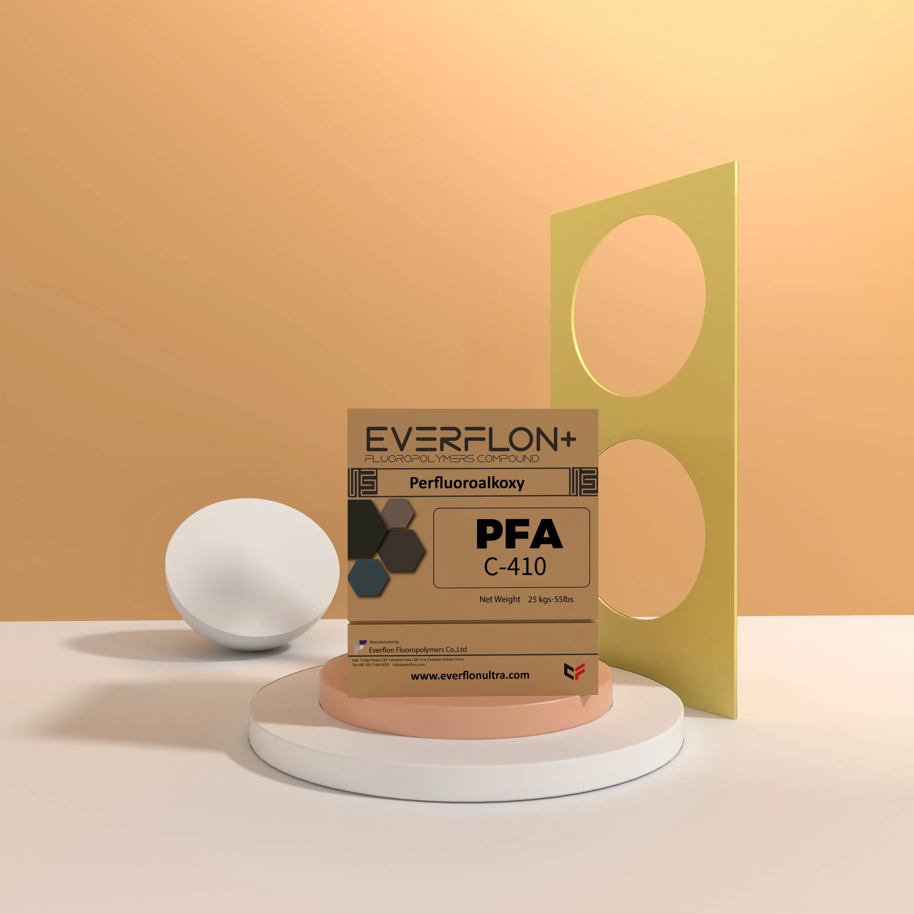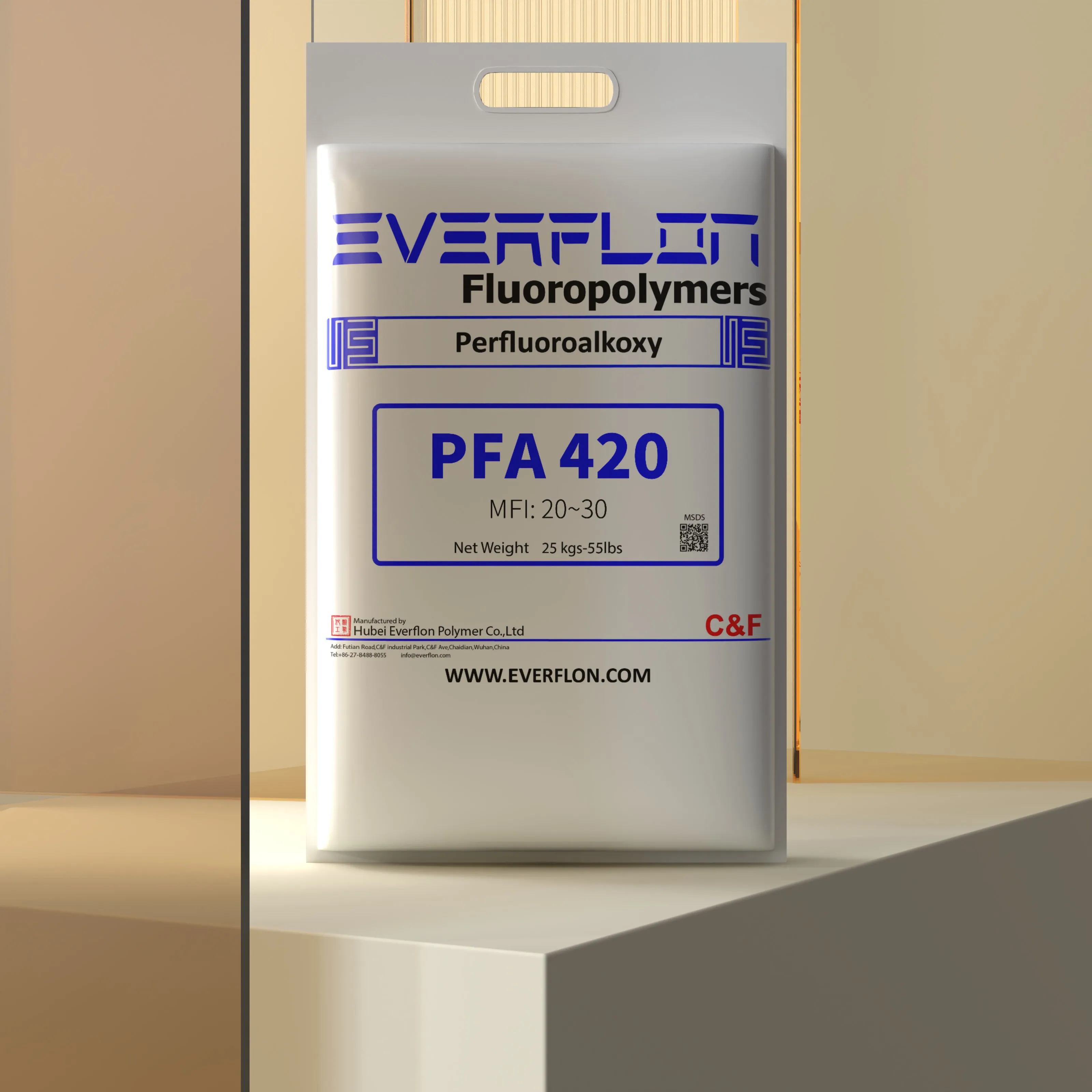 The properties of Everflon™ PFA resin are not affected by storage time. Ambient storage conditions should be designed to avoid airborne contamination and water condensation on the resin when it is removed from containers. Everflon™ PFA is supplied as pellets and is available in 25-kg multilayer bags with an integral polyethylene liner.