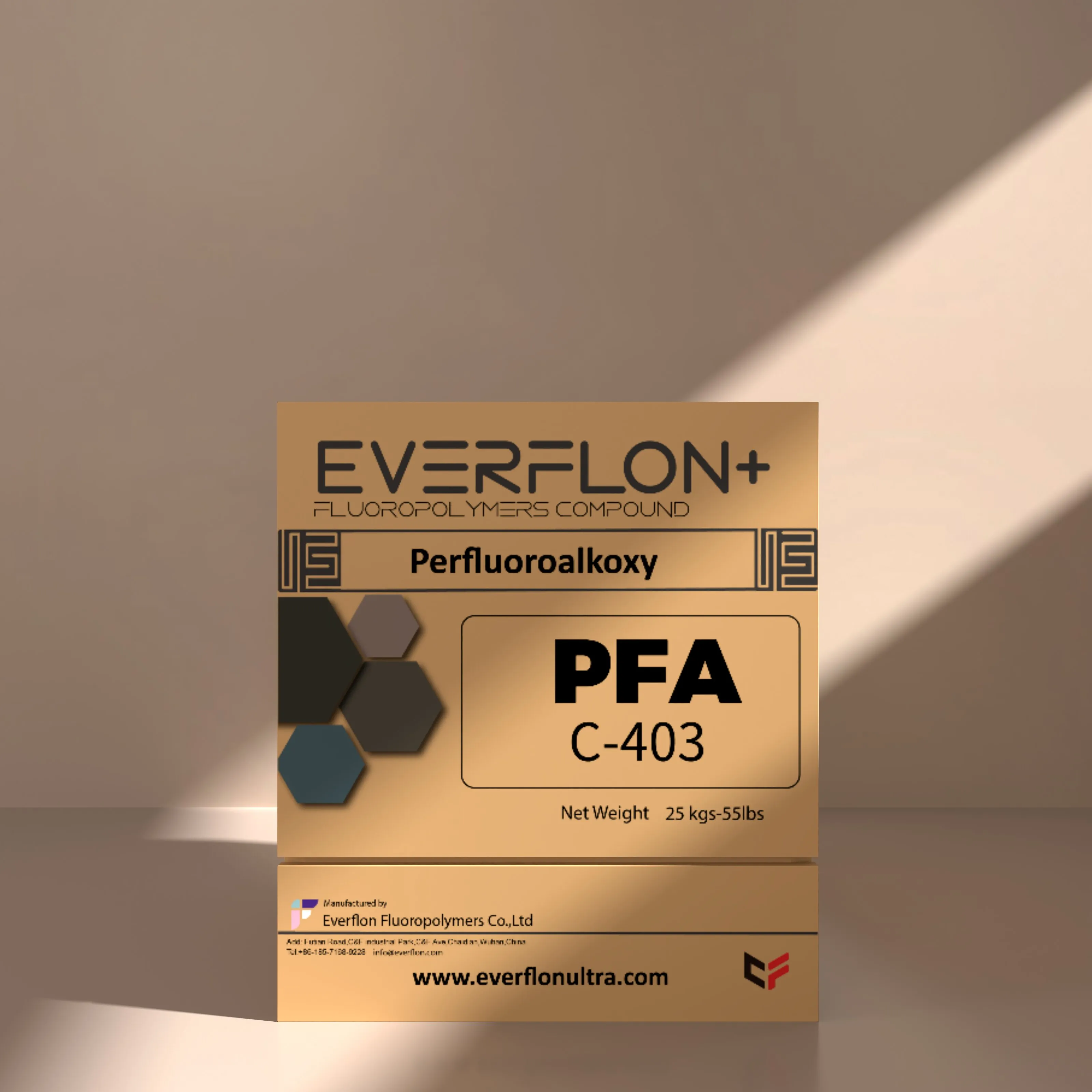 The properties of Everflon™ PFA resin are not affected by storage time. Ambient storage conditions should be designed to avoid airborne contamination and water condensation on the resin when it is removed from containers. Everflon™ PFA is supplied as pellets and is available in 25-kg multilayer bags with an integral polyethylene liner.