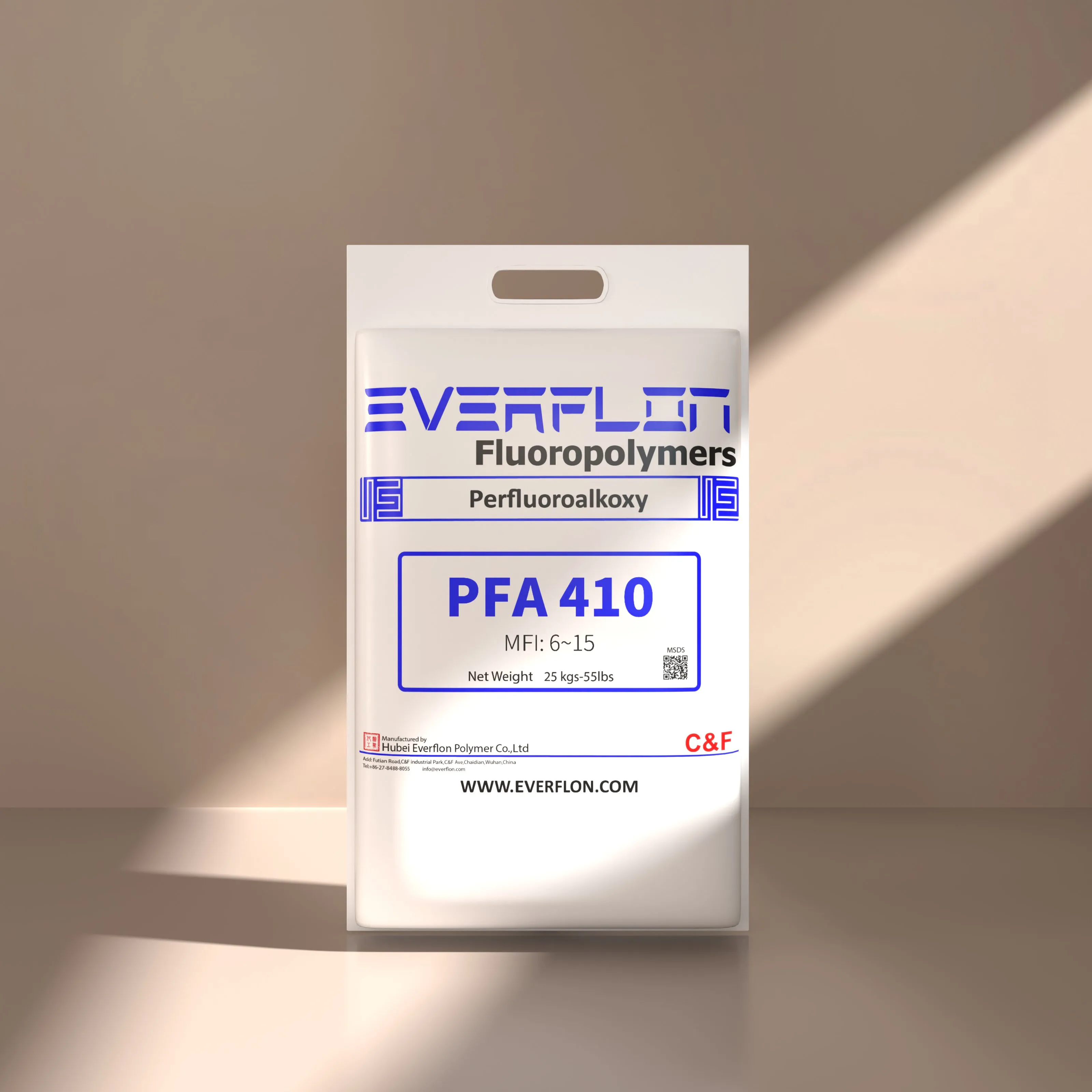 Everflon™ PFA is supplied as pellets and is available in 25-kg multilayer bags with an integral polyethylene liner.